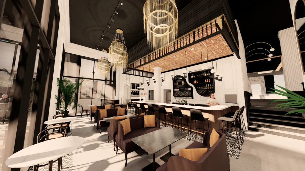 At the center of the hall, there’s a cocktail bar, which is perfect for grabbing a coffee or a cocktail while waiting for your food.